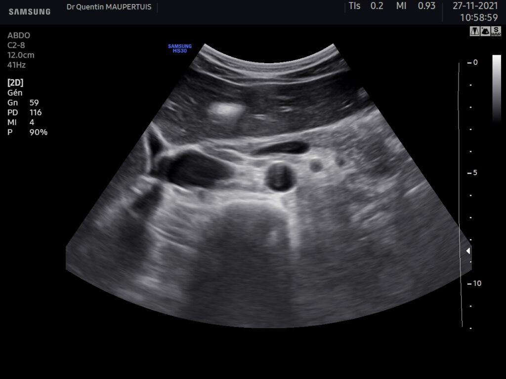 C’est une coupe qui permettra également l’identification et la mesure de la voie biliaire principale dans la tête du pancréas, à ne pas confondre avec l’artère gastro duodénale visible en avant de la voie biliaire principale.